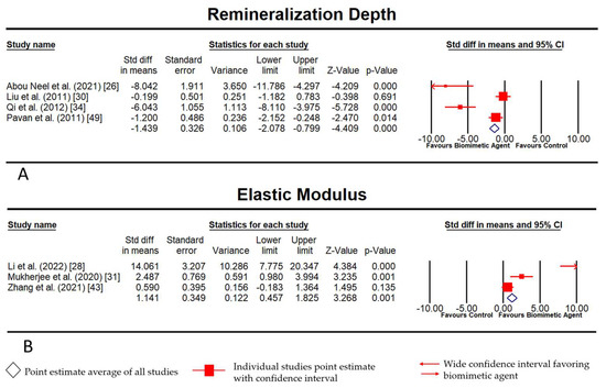 Comprehensive Meta Analysis®, v3.0, was used to generate the forest plot with a fixed-effects model of incorporated studies assessing two outcomes, viz., the extent of remineralization (Figure 3A) that showed a significant p value of 0.00, whereas the p value for the elastic modulus was 0.001 (Figure 3B), indicating that we can discard the null hypothesis. Some of the dispersion was caused by actual variations in the research effects rather than just random errors. In addition, it was observed that there was a large dispersion between the studies as shown in Figure 3. It, however, shows that the results favor biomimetic treatment more than we can attribute to chance. The Z value was 3.268 with p < 0.01 and, using a criterion of alpha at 0.05, we discarded the null hypothesis and concluded that the mean effect size was not precisely 0. The Q-statistic of 21.24 and p value of 0.00 prove that the size varied between studies. A high I2 statistic was observed in both outcomes (Extent of remineralization—90.56 and elastic modulus—91.96), suggesting that the reflection of proportion was due to true effects rather than sampling errors. Thus, it can be inferred from the final data that differences in methodology, treatment time, and concentration of the biomimetic agents in each group resulted in a significant heterogeneity amongst the studies.