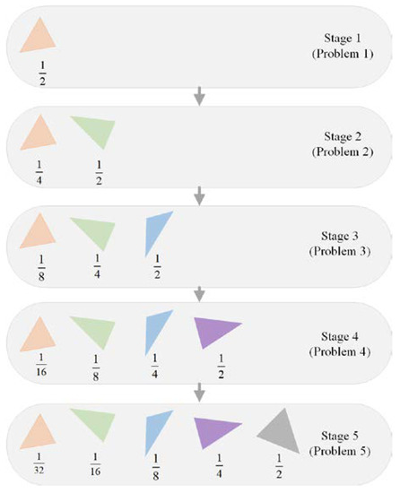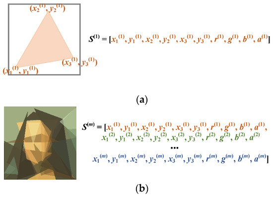 It is interesting to note that the image reconstruction problem was first posed in a blog published by Roger Johansson [44]. Johansson presented the idea of reconstructing one of the most famous paintings in the world, the Mona Lisa, using a number of transparent polygons. One would need to adjust the shape and position of the polygons, as well as their colors and transparency, so as to make the reconstructed image as close to the original image as possible. This task can be formulated as an optimization problem, in which the decision variables correspond to the parameters of the polygons. Suppose that the i-th polygon Pi has ni vertices; then, Pi can be represented by a list of parameters, i.e., [x1, y1, x2, y2, …, xni, yni, r, g, b, a]. The tuple (xj, yj) denotes the coordinate of the j-th vertex. The last four elements encode the color and transparency of Pi. Suppose there are, overall, m polygons; a candidate solution is represented by a sequence of polygons, i.e., [P1, P2, …, Pm]. If all the polygons have the same number of vertices, i.e., n, then the total number of decision variables would be (2n + 4) × m. Therefore, the number of decision variables grows linearly as the number of polygons increases. Figure 1 illustrates the solution encoding. In the figure, each polygon has three vertices. The parameters of the polygons are concatenated to form a long vector.