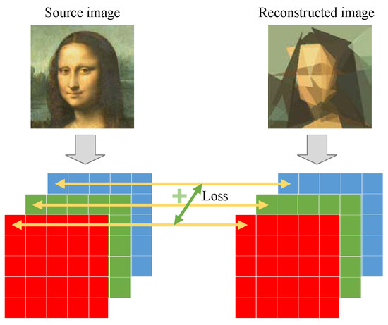 where W, H, and C denote the width, height, and number of channels of the image. A channel is the grayscale image of a colored image, which is made up of only one of the primary colors that form the colored image. Primary colors are basic colors that can be mixed together to produce other colors. For RGB images, the primary colors are red, green, and blue. Each pixel of an RGB image is made up of three channels, with each channel representing a primary color. The goal is to minimize the objective function. A zero-function value indicates that the polygons completely restore the source image X.