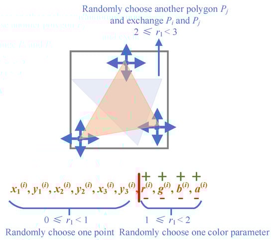 Hill climbing starts with a random candidate solution S0, in which all the parameters of the polygons are randomly sampled from their feasible regions. Then, it enters a loop that tries to iteratively improve the candidate solution. Suppose that the current candidate solution is St; a mutation operator that makes random changes to St is designed to produce new solutions. Specifically, a polygon from the candidate solution is randomly chosen, and one of its parameters is changed. Suppose that the i-th polygon Pi is chosen to be modified. A random real number r1 within [0.0, 3.0] is first generated. If r1 is less than one, then the color or transparency of the polygon is changed (Algorithm 2). The parameters a, r, g, and b have an equal chance of being modified. If r1 is in the range [1.0, 2.0], the position of a vertex is modified (Algorithm 3). The value of the x-coordinate or the y-coordinate is changed. In the above two cases, the selected parameter value is either increased by a small value or set to a random value within its feasible range. The decision is made by sampling another random value r2 within [0.0, 1.0]. If r1 is larger than two, another polygon Pj is randomly selected, and the stacking sequence of Pi and Pj is exchanged (Algorithm 4). A new solution St+1 is generated in this manner. Subsequently, the objective function value Lt+1 of the new solution is calculated. If its objective function value Lt+1 is less than that of St, then St+1 is replaced with St. Otherwise, the new solution St+1 enters the next iteration. The above process is repeated until the maximum number of iterations is reached. Figure 3 illustrates the mutation operator. For a randomly selected polygon Pi, the mutation operator makes changes to one of three components, namely, the position of the vertices, the color/transparency, and the position in the stacking sequence.