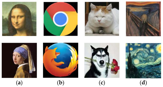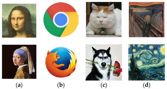 Benchmark test cases. (a) First category: famous portrait paintings; (b) second category: logos of popular browsers; (c) third category: pictures of animals; (d) forth category: impressionist paintings.