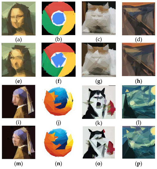 Reconstructed images produced by the two algorithms with 50 triangles. Images (a–d) and (i–l) were reconstructed by ProHC-EM. Images (e–h) and (m–p) were reconstructed by HC.