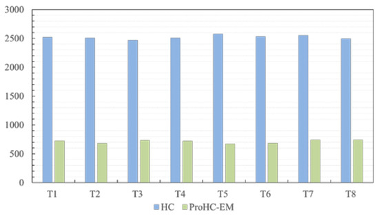 Average running time of ProHC-EM and HC over 25 independent runs for the eight test cases. The y-axis shows the running time of the algorithms in seconds.