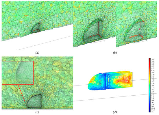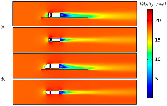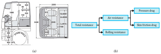 The resistance of a truck moving through the air is composed of two parts: skin friction drag and pressure drag [14] (see Figure 1b). In this study, we concentrate on reducing pressure drag due to the fact that skin friction drag hardly varies in relation to the shape of the truck [15]. The air resistance increases in importance at increased vehicle speed. Skin friction drag hardly changes during such speed changes, but pressure drag increases dramatically with speed [15,16,17]. Therefore, when aiming to reduce fuel use, a reduction in pressure drag seems to be the most logical choice, with the highest likelihood of resulting in emission reductions.