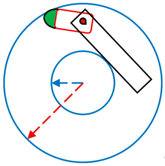 Recent, EU regulations relating to the size constraints of an articulated truck–trailer configuration to allow for design changes aimed at reducing fuel consumption and emission levels [16,34,35]. The new regulations allow for a length increase, which should not be designated for increased payload volume but to allow for design changes that result in decreased fuel usage and lower emissions. At the same time, the truck + trailer’s road behavior, especially on narrow roads, curves and roundabouts, should be the same as before [19]. Within these boundary conditions, we see many possibilities for serious design changes that will have the desired effects, e.g., no mirrors, extended truck noses, rounder corners, improved driver field of view, etc. As Figure 3 shows, the outer (red radius) and inner (blue radius) circle of a minimal-size roundabout according to EU regulations are, respectively, 12.5 m and 5.3 m. The green region is the possible extension space for the new tractor design [16]. The streamlined design will have to match or be smaller than the round, green-colored extension to stay within EU regulations [16]. This yields about 1.5 m extra length when designed appropriately.