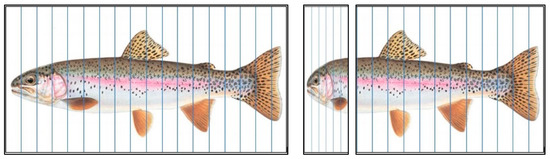 The rainbow trout’s body is meshed with a series of equidistant vertical lines that divide the body of the trout into sections with equal widths (Figure 4 and Figure 5). Subsequently, a deformation process is applied to the part of the trout that needs to be re-scaled, in this case, the front part from where the outline slope is horizontal (just in front of the dorsal fin) to where the outline slope is vertical (just above the mouth opening) (see Figure 4 and Figure 5). In this process, the lines in the deforming part are kept equidistant but at varying distances until the necessary re-scaling has been accomplished. Then, the morphometric information of the deformed biological model is analyzed and further processed into a smooth curve. The result is, in this case, a curve following the outline of the trout body in the target part but compressed along the X-axis. Finally, the data are fitted from the compressed outline to a mathematical function (ImageJ) that can be further used in the truck design process. In summary: