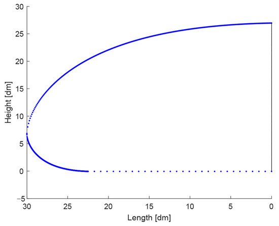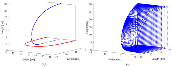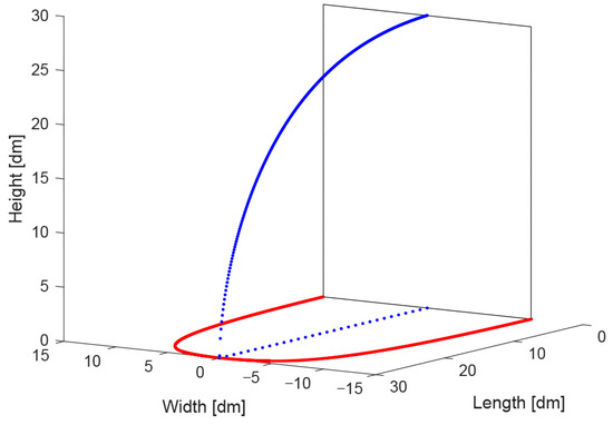 These curves are visible in a 3D plot in Figure 8 as a blue curve (side view outline, Equation (4)) and a ‘left’ and ‘right’ red curve, together forming the top view (Equations (5) and (6)).