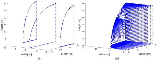 The two curves of the side view and top view are now expanded to a 3D volume by scaling the side view curve according to its position on the bottom curve. Figure 9a shows the central side view curve as well as two intermediate curves to the left and to the right. Figure 9b shows a whole series of curves on one side of the central curve, indicating one side of the 3D volume. Note that the rear side of the 3D volume is rectangular because the front side of a trailer is rectangular; the height–width ratio (H/W) of the rectangle is 1.35 (see Table 1), similar to the trailer.