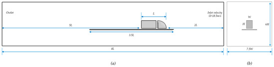 The splitter plate should extend at least two times the length of the object upstream and five times its length downstream [37]. With an L = 8.5 m truck, the upstream length is minimally 2 L and the downstream length is minimally 5 L. The total domain length being minimally 8 L (see Figure 13) [37]. In our CFD work, we chose a total length of 75 m (see Table 3). The length of the trailer was taken as 5 m, which is relatively shorter than a normal truck. Because we concentrated on the tractor, a shorter trailer received less simulation time. The tractor–trailer gap is set to 0.5 m, again for reasons of reducing simulation time.