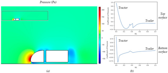 3-dimensional pressure distribution, (a) Surface distribution, (b) Distribution of the pressure indicated as iso-surfaces in front of the truck (left figure) and behind the trailer (right figure).