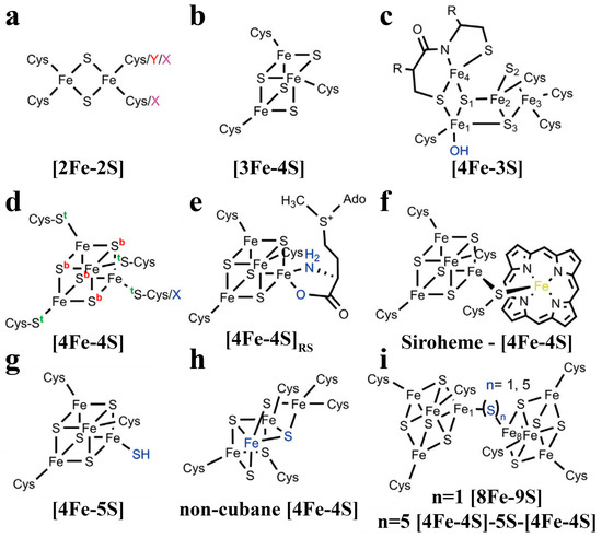 Common forms of [FeS] clusters. These clusters have various functional roles in different proteins. (a) [2Fe-2S] cluster; (b) [3Fe-4S] cluster; (c) [4Fe-3S] cluster; (d) [4Fe-4S] cluster; (e) [4Fe-4S]RS cluster; (f) siroheme-[4Fe-4S] cluster; (g) [4Fe-5S] cluster; (h) non-cubane [4Fe-4S] cluster and (i) [4Fe-4S]-Sn-[4Fe-4S] clusters (n = 1, 5) [46]. Copyright 2022 Elsevier.