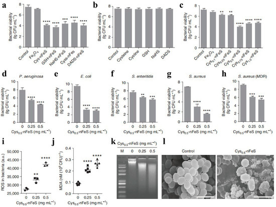 Antibacterial activity of nFeS. (a) Antibacterial activity of nFeS converted from different organosulfur sources against S. mutans UA159; (b) antibacterial (S. mutans UA159) activity of organosulfur compounds; (c) dependence of antibacterial (S. mutans UA159) efficacy of Cys-nFeS on the amount of cysteine input into the solvothermal synthesis; (d–h) antibacterial activity of nFeS on P. aeruginosa, E. coli, S. enteritidis, S. aureus and S. aureus (MDR), respectively; (i,j) ROS level and lipid peroxidation of bacteria treated with Cys-nFeS; (k) genomic DNA degradation of bacteria treated with Cys-nFeS; (l) SEM image of bacteria treated with Cys-nFeS [106]. Means ± SD are shown (n = 3) (** p < 0.01, *** p < 0.001, **** p < 0.0001) Copyright 2018 Nature Publishing Group.