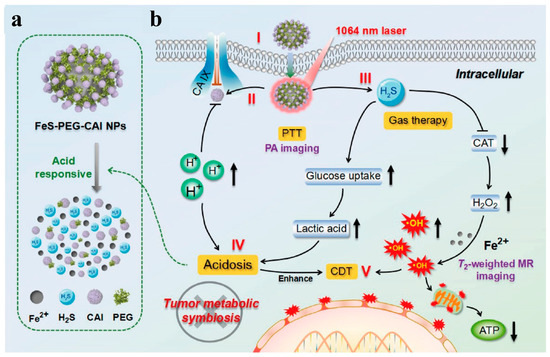 (a) Degradation behavior and (b) tumor therapy mechanism of FeS-PEG-CAI NPs [72]. Copyright 2022 American Chemical Society.