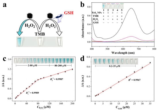 (a) Schematic illustration of colorimetric detection with H2O2 and GSH based on FeS2 NPs as the sensing platforms; (b) UV–Vis absorption spectra of the reaction system with different reagents; linear calibration plots for the detection of (c) H2O2 and (d) GSH. Inset: photographs of corresponding samples [117]. Copyright 2020 Elsevier.