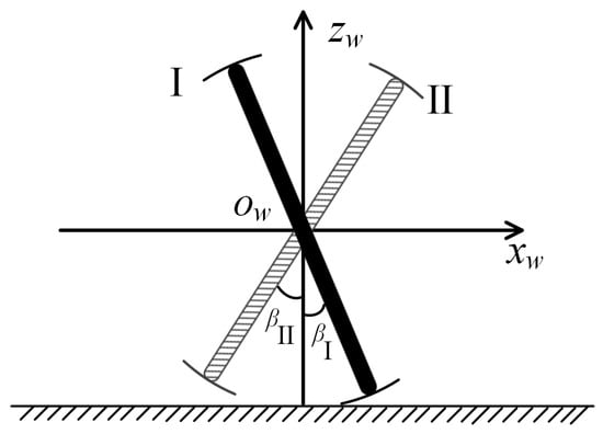 In order to facilitate the description of the trajectory planning of the two spoke components in the FSM wheel, we used a simplified two-dimensional geometric model of the FSM wheel, as shown in Figure 5. We used a rectangular rod to represent the spoke component of the FSM wheel and an arc with a radius of and an angle of to represent the roller. In Figure 5, the black rectangular rod with arc lines at both ends is called Spoke Component I, and the gray rectangular rod with arc lines at both ends is named Spoke Component II. The axis of the coordinate system is perpendicular to the ground plane. The axis is parallel to the ground plane and points to the right side of the FSM wheel’s geometric model, and the origin is the center of the two spoke components. is the angle between Spoke Component I and the axis, and is the angle between Spoke Component II and the axis. Due to the structural symmetry of the FSM wheel, and have a range of 180, which can describe all the positions of the corresponding spoke component. In order to facilitate the subsequent description of the trajectory planning of the spoke component, we took . When , Spoke Component I has the same configuration as when ; that is, is equivalent at its value boundary. Similarly, is also equivalent at its value boundary.