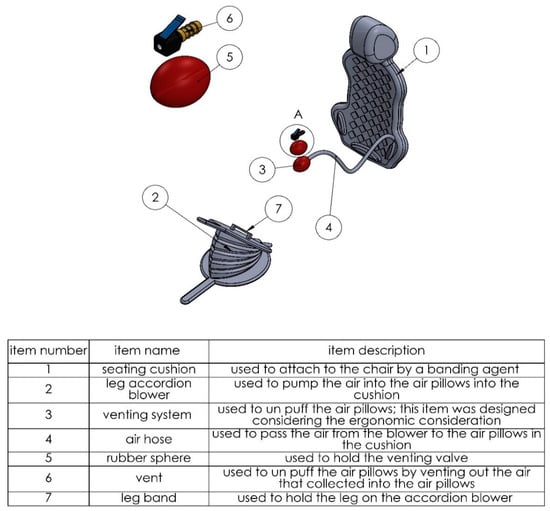 In this subsection, the analysis of the customer surveys fructifies the novel design of the chair attachment cushion with four alternatives to the chair user contact area reduction system. The way that these systems operate is different. Nonetheless, they all lead to the same outcome; minimizing the area of contact between the chair and the user to prevent the development of skin health issues such skin sores, pressure ulcers, and numbness. These systems of instantaneous contact area reduction are the manual blowing system using the accordion blower, the manual blowing system using the pedaling mechanism, the automatic blowing system using the gas expanding principle, and the automatic blowing system using a driving motor. The cushion is the same for all four systems, but with different operating methods to blow the air cell inside the attachment cushion. In the following subsections, each system will be introduced with descriptive illustrations and (CAD) drawings.