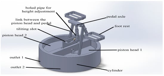 As seen in Figure 6, the user blows the air cell manually in this operating system by exercising (pedaling) to pump air into the air cell. The design of the pedaling system contains different parts, as demonstrated in Figure 7. The design consists of two separated champers, each of which is connected to a set of air pillows inside the air cell by a hose, two piston heads are used to compress the air inside the chambers and pump it to the air cell. Two linking bars join the piston heads to the pedal cranks. Modified pedal cranks are used to translate the rotational movement of the pedals to a translational motion of the piston heads to achieve the blowing operation, and two foot rest pedals are used to locate the user’s feet.