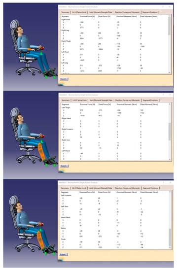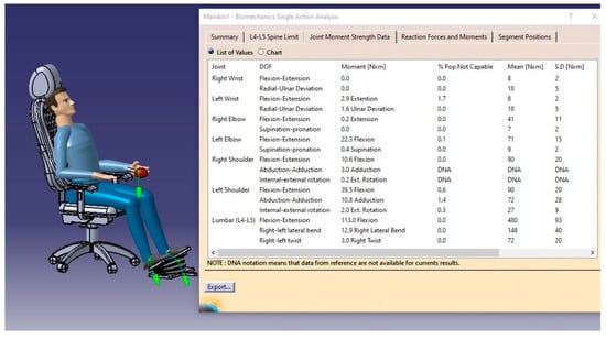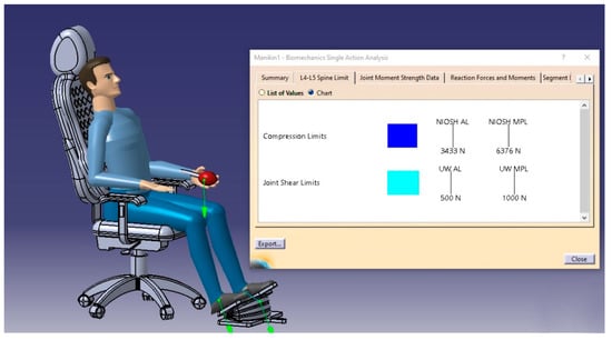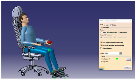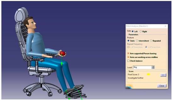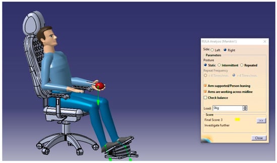 The proposed design of the chair attachment cushion should be analyzed ergonomically to check its compatibility with the user. The ergonomic analysis in the presented research will be performed by applying the rapid upper limb assessment (RULA) approach to assess the sitting postures of the user on the selected design. Using the resulting RULA score, it can be decided whether the design is suitable for the user and satisfies the health and safety considerations. The RULA analysis is a useful tool for estimating the MSDs that humans experience when engaging in activities such as everyday chores, sports, sitting positions, and other situations [35]. This tool gives a score out of 7 (the highest score of risk), so a procedure should be taken to eliminate that score to be acceptable and reduce the risk factor of such posture. The (RULA) analysis, as well as the biomechanics single action analysis of the selected design, will be performed, explained, and discussed in the results section of this study.
