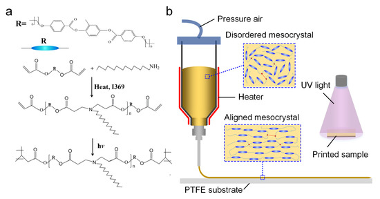 The process of LC ink design and printing. (a) Synthesis of the photopolymerizable LCEs. (b) The schematic illustration of temperature-controlled DIW of the LC ink and UV curing of printed samples.
