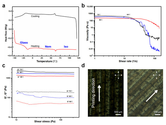 (a) DSC thermograms of the prepared LC ink. (b) Logarithmic curve of LC ink viscosity versus shear rate. (c) Storage modulus G′ and loss modulus G″ as a function of shear stress. (d) POM images of the printed sample when the printing direction is 0° and 45° to the polarizer.