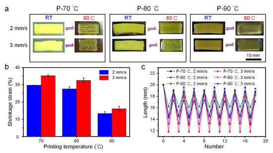 Deformation of LCE at different printing temperatures. (a) Optical images of samples printed under different temperatures (70, 80 and 90 °C) at room temperature and heated to 80 °C. P-70 °C, P-80 °C and P-90 °C represent the printing temperatures selected for the samples, respectively. (b) The relationship between shrinkage strain and printing temperature under different printing speeds. (c) The relationship between the length of axial shrinkage and the number of cycles under different printing temperatures.