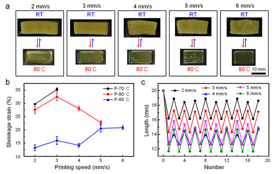Deformation of LCE at different printing speeds. (a) Optical images of reversible shape change of samples printed at 90 °C with different speeds, under room temperature and 80 °C. (b) The relationship between shrinkage strain and printing speed under different temperatures. (c) The relationship between the length of axial shrinkage and the number of cycles under different printing speeds.