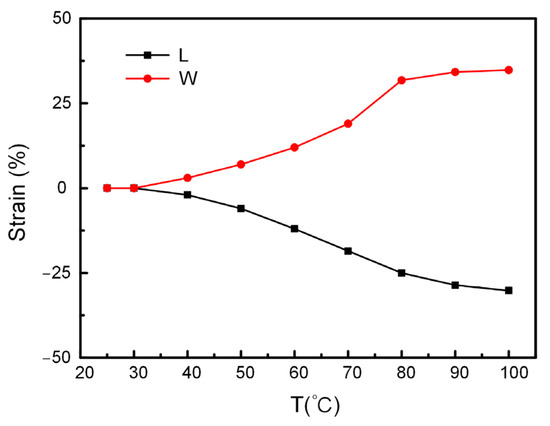 In addition to printing temperature, printing speed and printing angle, the actuation temperature also affects the deformation degree of the printed sample. The LCE film printed in a single direction with a printing temperature of 80 °C, a printing speed of 3 mm/s and a printing angle of 0° was selected as the test sample. Figure 7 showed the variation trend of shrinkage strain along the length (L) and width (W) directions at different temperatures. It could be seen that with the gradual increase in temperature, the degree of strain increased gradually, whereas up to 80 °C, the increase rate of the strain degree slowed down and approached the maximum strain with about 35% in the length direction. Hence, the temperature of 80 °C was selected as the actuation temperature for the subsequent structural deformation applications.