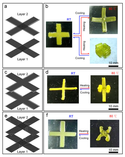 A double-layer cross-shaped structure was designed, each layer with four branches and a central connection (Figure 8a). The printing path of each branch in layer 1 was parallel to its long axis direction, while each branch of layer 2 was 90 degrees perpendicular to layer 1, and the central part of both layers was in ring-shaped filling mode. By exchanging the order in which the two layers of material were printed one after the other, two LCE double-layer cross-shaped structures with quite different changed shapes were obtained (Figure 8b). Each branch of the former bent and deformed along the short axis to produce a shape similar to a channel, while the latter flexed and shrank along the direction of the long axis. The reason behind this phenomenon is that the active layer in the two layers of material has changed. During the printing process, the layer that is first printed contacts the substrate directly, and then the second layer presses the previous layer, which has a certain effect on the crystal phase of the first layer, causing the actuating ability of the first layer to be weak. Here, the deformation of the former was caused by the shrinkage of the short axis, where layer 2 acted as the active layer, while the latter became the dominant layer inversely.