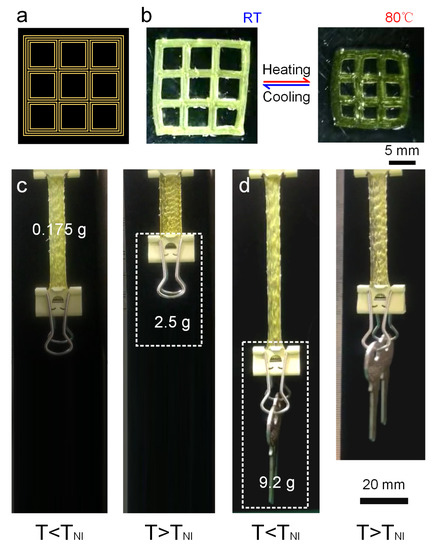 Then, a single-layer planar mesh structure was designed by planning extrusion paths (Figure 9a). The printed grid structure shrank uniformly for each filament at 80 °C, finally presenting a flat grid structure with reduced pores. The side length of the pores shrank from 4.067 mm to 2.595 mm with a shrinkage rate of 36.2% (Figure 9b). Meanwhile, a four-layer LCE strip with an initial size of 40 mm × 8 mm × 0.8 mm with an initial mass of 0.175 g was selected to explore the shrinkage ability under load. After loading a 2.5 g object, the strip was stretched, and shrinkage deformation occurred after heating (Figure 9c). The first shrinkage strain in the length direction was 46.5%, which was close to half of the initial length. After returning to room temperature, while further increased to a load of 9.2 g, i.e., more than 50 times the initial mass, the LCE strip can still shrink after heating, realizing the lifting of heavy objects (Figure 9d). Nevertheless, the shrinkage strain shrank by 38.8% compared to the length after being stretched, which was due to a decrease in the mechanical properties of the LCE under heating conditions.