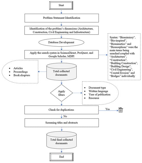 This review was based on secondary research and investigated the concept of biomimicry from a large collection of scholarly articles found in the following databases: ScienceDirect, ProQuest, and Google Scholar (Figure 1). The reviewed publications spanned across the following fields: Architecture, Construction, Civil Engineering, and Infrastructure. Keywords used in the search included: “Biomimicry”, “Bio-inspired”, “Bio-mimetics”, and “Biomorphism” as the main term, coupled with “Architecture”, “Building Construction”, “Building Design” “Civil Engineering”, “Coastal Erosion”, “Road Construction”, “Bridge Construction”, “Bridge Engineering”, “Water Network”, “Sewage Network”, “Stormwater Network”, “Master Planning”, and “Transportation Engineering” through individual searches. The papers were selected based on the following search criterion: range of publication between years 2000 and 2022, relevance of title and abstract to the application of the biomimicry concept in one or more of the mentioned fields, and the content being strictly from an architectural or engineering aspect, while the exclusion criterion allowed for emitting any publication not belonging to a journal or a conference proceeding. However, due to the lack of scholarly articles discussing the application of biomimicry in the civil engineering/infrastructure field, scientific blogs and websites were referred to during the search through queries in Google Scholar.
