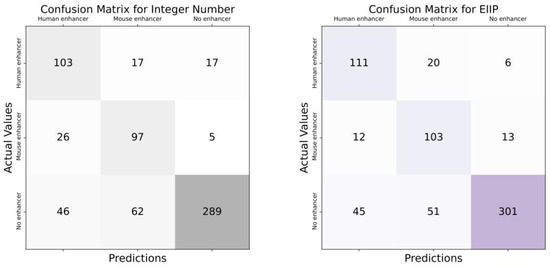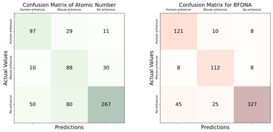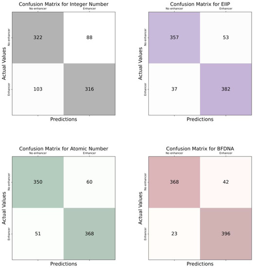 - In studies on most DNA sequences, it has been observed that the chemical properties of DNA sequences are also used [52,53]. However, various experimental applications are used to determine these chemical properties. As this requires experimental equipment, it is both costly and time-consuming. With this study, it has been shown that DNA encoding methods used in computational approaches can also be effective in studies on DNA sequencing. When DNA enhancer studies were examined, it was observed that some studies focused on the chemical properties of DNA sequences [54,55,56,57,58]. When the performances in those studies were examined, it was observed that the accuracy scores ranged between 41.7% and 78%. In this study, only the integer number DNA encoding method was within this range, and an accuracy score of 77% was obtained. All remaining DNA encoding methods showed accuracy scores of over 85%. Moreover, the proposed BFDNA DNA encoding method achieved a high accuracy score of 92.16%. These results showed that computational features can also be effective.