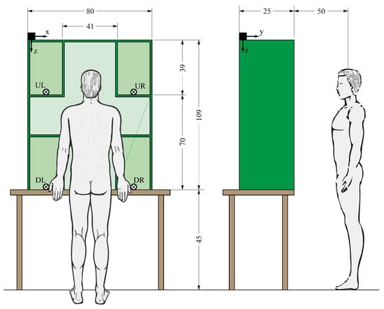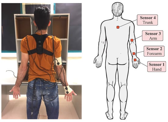 Five healthy volunteers without any known upper limb pathology participated in an object manipulation experiment following a protocol approved by the Ethics Committee of Universitat Jaume I (reference CD/37/2022). The subjects were university students, with a mean age of 20.4 years (standard deviation 1.5) and mean height of 174.8 cm (standard deviation 6.1). All of them were right-handed males except for one who was ambidextrous. The subjects were equipped with different sensors using the Polhemus Fastrak motion capture system, which allows the position and orientation of up to four sensors to be instantaneously recorded with respect to a fixed transmitter. Four sensors were used placed in the following positions on the subject (Figure 1): hand, forearm, arm, and trunk (back). The arm sensors were sewn onto elastic Tubigrip® bands placed on the subject’s right arm, forearm, and hand. The trunk sensor was attached with Velcro to a posture-correcting harness for the back. The arm sensors were positioned so that the x-axis of the sensor pointed in the distal direction and that of the back was directed towards the ground. The Fastrak system transmitter was fixed on the horizontal upper surface of the shelf in the back left corner so that the reference x-axis pointed towards the subject’s right, the y-axis towards the subject, and the z-axis downwards (see Figure 2). With the chosen setup, all sensors moved during the experiment in the hemisphere of the Fastrak system transmitter.