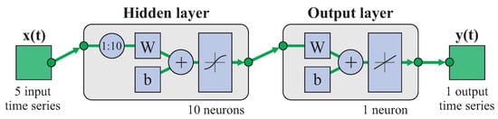The training and testing of the neural networks was performed using Matlab. Two different approaches were considered with different levels of complexity, using a simple feed-forward neural network (FFNN) in one case and a time-delay neural network (TDNN) in the other. For this purpose, the feedforwardnet and timedelaynet functions of Matlab’s “Deep Learning Toolbox” were used, respectively.
