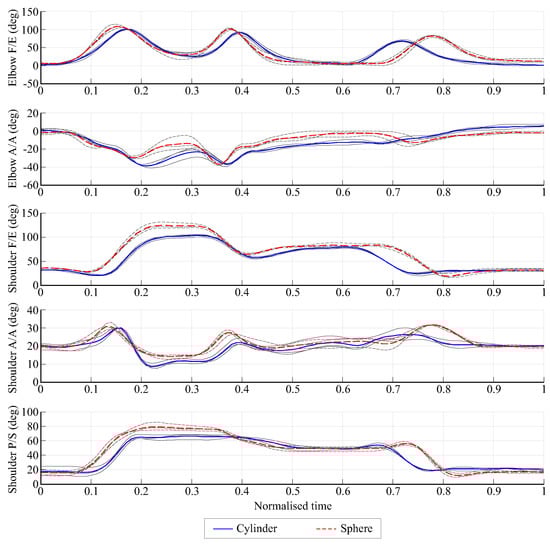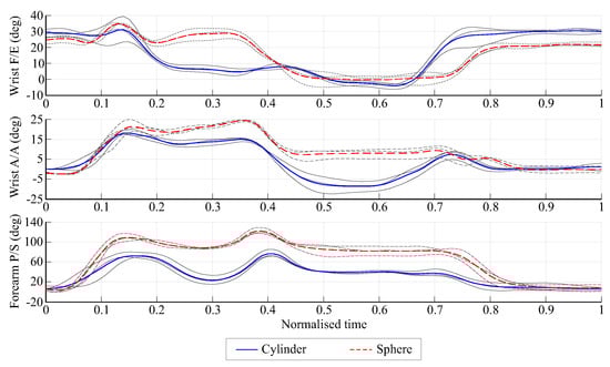 Figure 6 shows an example of the angles at the wrist for subject one in the movement from UL to DL for both objects (cylinder and sphere). The three repetitions and the mean value are shown, indicating the good repeatability of the measurements. The results showed different movements at the wrist for each object, with more pronounced differences in the F/E pattern and in the amplitude of the P/S movements. The movement with the largest range was the P/S movement and the smallest range was the A/A movement. The mean range of amplitude for these angles averaged across subjects during all the experiments was for F/E, for A/A, and for P/S.