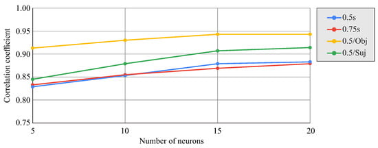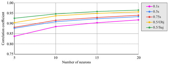 Figure 12 shows the change in the correlation coefficient between the actual and network-predicted results for all time series from the test group cases as a function of the number of neurons in the hidden layer and the time delay amplitude used (, , or ). There was a tendency for the correlation to stabilize around 15–20 neurons. Similarly, increasing the amplitude of the time delay also improved the prediction, although the improvement between and was very limited. If the input data had an amplitude of but were ahead of the prediction instant, the prediction deteriorated, lowering the correlation coefficient by about (not shown in the figure). The figure also shows, for the time delay amplitude of , the effect of restricting the dataset to data corresponding to each object separately (the average of both objects is shown with differences between them being less than in terms of the correlation coefficient) or to data corresponding to a single subject (the result for subject one is shown). In both cases, the restriction of the dataset used allowed the improvement of the correlation coefficient.