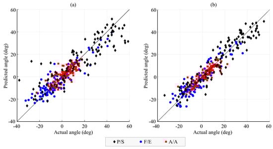 Table 5 shows the performance of the linear regression models fitted considering the data from all the experiments. The mean absolute errors in the angles were greater and the CCs lower than those obtained with the FFNN and TDNN. A higher CC was obtained for the P/S angle compared to the F/E and A/A angles.