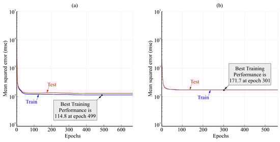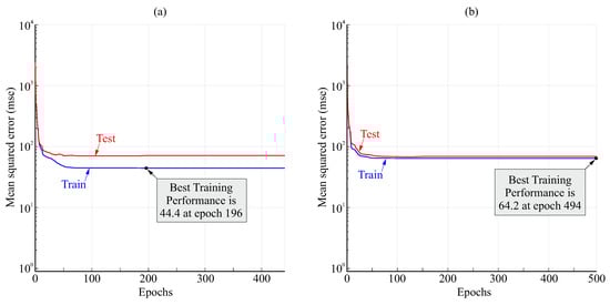 Figure 10 shows examples of the variation in the loss function (mean squared error) during the training process for the FFNN with anticipation of and 20 or 10 neurons in the hidden layer. The loss stabilized to a nearly constant value after less than 100 epochs. A greater difference between test and train values for 20 neurons than for 10 neurons can be observed, which may indicate some degree of overfitting for 20 neurons.