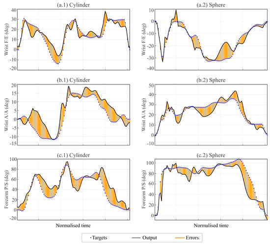 Figure 11 shows a randomly selected example of the results for the transport of each object predicted with the TDNN with the training function trainbr using as input data the angles for F/E and A/A at the elbow and the three angles of the shoulder and comparing the actual value (target) with the prediction of the network (output). In this example, the networks used, which differed for each output angle, included 15 neurons and predicted the wrist angle for each instant from the input data recorded in the previous 15 instants (equivalent to a time delay of approximately ). The results show that the predictions exhibited, in general, a larger oscillation than the actual curve, but they approximated the evolution of the actual curves well.
