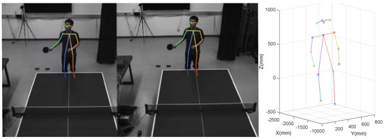 In this paper, we adopt the Fast Pose 17 human posture model [27]. The 17 key points of the human body for this model are given in Table 1. As shown in Figure 2, the binocular camera first identifies the location of the key points, and then obtains the 3D position of each key point via the 3D reconstruction. The identification error of the coordinate position of the key points is within 2 cm, which satisfies the experimental requirements.