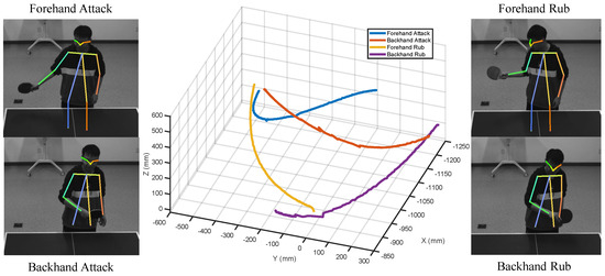As shown in Table 2, each type of ball rotation corresponds to a different type of stroke, which includes forehand attacking, forehand rubbing, backhand attacking, and backhand rubbing. To better return a ball, we need to identify the stroke type of the opponent. To this end, for each stroke type, we collect 500 motion sequences of coordinate of the opponent’s racket hand, as shown in Figure 3. Based on the collected data, the SVM (support vector machine) can be trained and then used to predict the stroke type of the opponent.