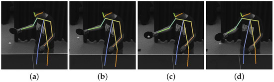 Forehand and backhand stroke simulations. (a) Forehand stroke: stage 1; (b) Forehand stroke: stage 2; (c) Forehand stroke: stage 3; (d) Forehand stroke: stage 4; (e) Forehand stroke imitation: stage 1; (f) Forehand stroke imitation: stage 2; (g) Forehand stroke imitation: stage 3; (h) Forehand stroke imitation: stage 4; (i) Backhand stroke: stage 1; (j) Backhand stroke: stage 2; (k) Backhand stroke: stage 3; (l) Backhand stroke: stage 4; (m) Backhand stroke imitation: stage 1; (n) Backhand stroke imitation: stage 2; (o) Backhand stroke imitation: stage 3; (p) Backhand stroke imitation: stage 4.