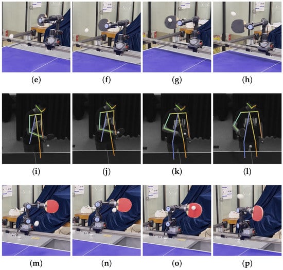 To return the ball, we design a humanoid 4-DoF robotic arm. Figure 5 shows how the humanoid robotic arm simulates the forehand and backhand attacking or rubbing of a player. Specifically, Figure 5a–d show that the player has completed a forehand stroke; in Figure 5e–h, the robot imitates the forehand stroke behaviors shown in Figure 5a–d, respectively. Similarly, Figure 5i–l illustrate that the player has completed a backhand stroke, and in Figure 5m–p, the robot imitates the backhand stroke behaviors shown in Figure 5i–l, respectively.