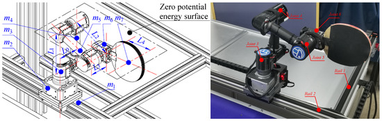 To track the designed acceleration and velocity of the robot in real time, we need to analyze the robot’s dynamic model. To this end, we first analyze the kinematics of the robot arm. As shown in Figure 6, we establish the coordinate system of the robot. The D-H parameter method is used to obtain the position and attitude of the racket. The D-H parameters of the table tennis robot system can be found in our previous work [24].