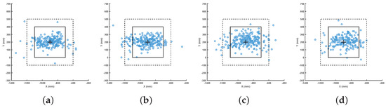 As shown in Figure 7 and Figure 8, a target square area is prespecified and is set as the target point. In Figure 7, the squares composed of the dotted lines and solid lines correspond to the outer square and the inner square, respectively, in Figure 8. Moreover, to clearly show the performance of our method, we use “+” to mark the target point.