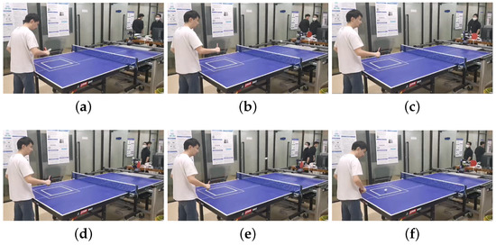 Experimental process. (a) Backhand attack: touching; (b) Backhand attack: flying; (c) Backhand attack: landing; (d) Backhand attack return: touching; (e) Backhand attack return: flying; (f) Backhand attack return: landing.