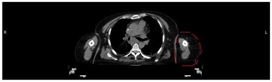 A CT scan of a female torso, acquired on a Brilliance CT Big Bore Oncology scanner (Philips, Hamburg, Germany) operating at 290 mA and 120 kV, was used to obtain the data for both morphology and density values as the basis for an anthropomorphic phantom representing part of the left upper arm (Figure 1). Based on density (CT numbers), the images were segmented in 3D Slicer (Alliance for Medical Image Computing (NA-MIC), Boston, MA, USA) into tissue classes corresponding to skin, cortical bone, bone marrow and soft tissue. The segmented tissues were exported as Standard Transformation Language (STL) files.