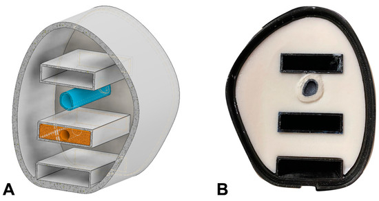After data acquisition and segmentation, the STL files were imported into the CAD software Autodesk Inventor (Autodesk Inventor, Autodesk Inc., San Rafael, CA, USA). The arm phantom was designed as a hollow body where other surrogates can be filled in after 3D printing (see Figure 2A). Three compartments were designed to integrate dosimeters at different positions inside the arm phantom.
