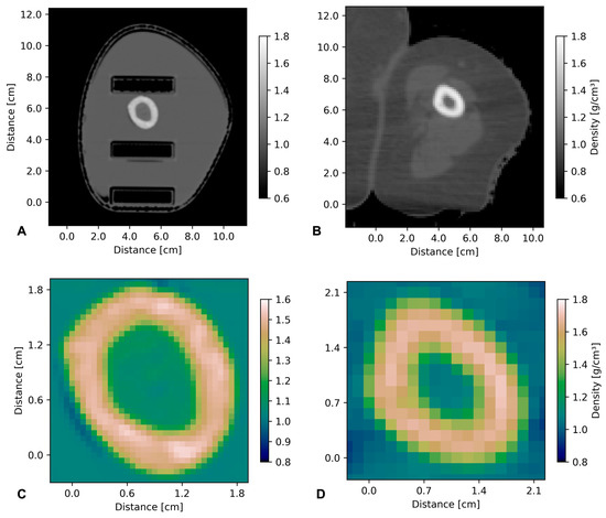 Comparison of density values between phantom CT (A,C) and original patient CT (B,D). Upper panel: CT images of phantom (A) and original CT (B). Lower panel: zoom on the area around the bone. In accordance with the numerical values, the density values are very similar in both CT scans. This is important because density values of different tissues/compartments are used as the basis for medical physics planning in modern radiotherapy. Inhomogeneities within the bone are seen in both the phantom and the human original CT.