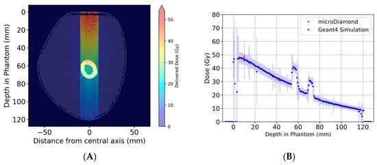 Geant4 simulations of broad-beam irradiation of arm phantom. The 2D dose distribution across the central axis of the beam is shown in (A). The dose at the center of the beam for each depth in the phantom, good agreement between Geant4 simulations and experimental dosimetry using the TPW microDiamond detector (B). The peaks at approx. 55 mm and 70 mm depth are due to the bone structures, while the material in between the bone structures, the bone marrow, has a density very similar to that of soft tissue. This is true for both the phantom and the patient data sets (see also Figure 4C,D).