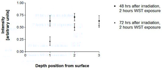 Due to the dose attenuation increasing with depth from surface, the extent of tumor cell destruction determined at 72 h after irradiation decreases with depth from surface (Figure 6). Interestingly, the measured values at 48 h after irradiation are almost equal at all three depth points. Only the values obtained at 72 h after irradiation are distinctly depth-dependent. A possible explanation would be that, at 48 h after irradiation, cell death is still mainly the result of necrotic cell death due to the high microbeam peak doses to which the cells were exposed, even at a depth of approx. 8 cm below the surface (Table 2). At 72 h after irradiation, however, we are looking at an effect already strongly modulated by the lower valley dose, bystander effects in the non-directly irradiated region between the microbeams. The valley dose of approx. 8 Gy at the sample position closest to the surface elicits a strong tumor-destructive response. With increasing depth from the surface, this dose decreases rapidly. At 8 cm depth, the valley dose contributes significantly less to additional tumor cell destruction.